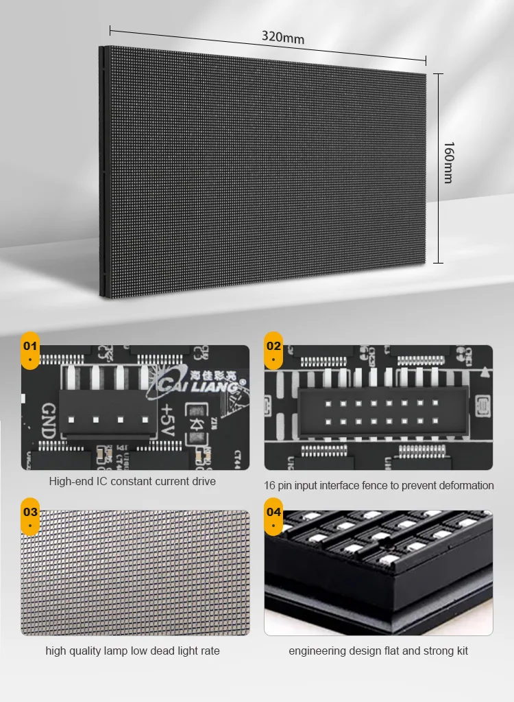 D3 Piksel aralığı: 3,076 mm Çözünürlük: 104*52 Piksel yoğunluğu: 105625 Parlaklık: 3500-4000 Lamba: SMD1415 Yenileme hızı: 1920/3840hz Tarama modu: 13S
